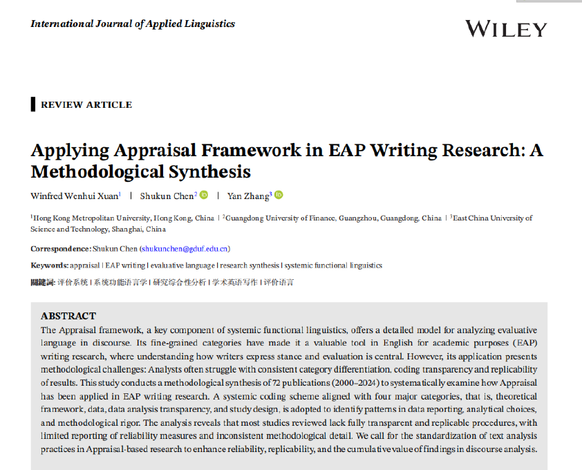 该研究由香港都会大学的禤文辉(我院客座教授)、永利集团3044am的陈树坤和华东理工大学的张艳共同完成。研究团队对2000至2024年间发表于国际期刊的72项相关研究进行了系统性编码分析,从理论框架、数据类型、分析透明度和研究设计四个维度,首次全面揭示了评价理论在学术英语写作研究中的应用范式与方法论挑战。研究发现,尽管评价理论为分析学术写作中的立场表达和评价性语言提供了精细工具,但现有研究普遍存在方法学报告不充分的问题:编码过程缺乏透明度、信度检验报告不足、方法细节不统一,导致研究结果的可重复性和可比性受限。这一发现直指语篇分析领域的核心痛点——分析的主观性与研究可复制性之间的矛盾。