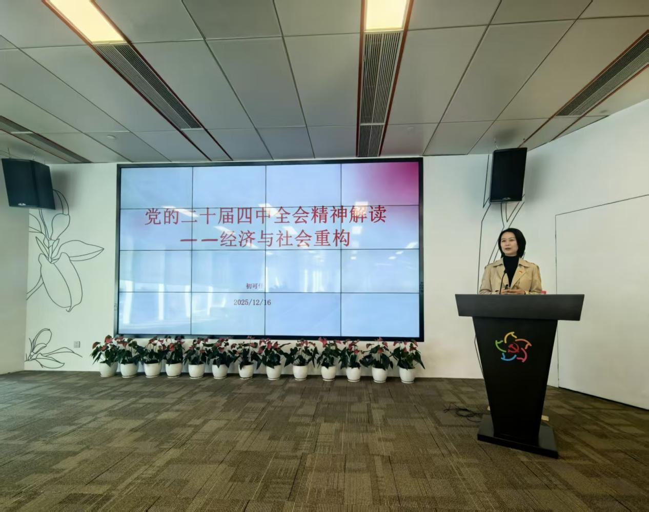 2025年12月16日上午,永利集团3044am、国际教育学院、教师发展中心、国际交流与合作处和广金诺丁汉教育合作中心等部分党员代表齐聚广州国际金融中心党群服务中心,共同聆听了一场以“党的二十届四中全会精神解读——经济与社会重构”为主题的专题党课。此次党课由学校党委委员、副校长初可佳主讲,旨在引导党员深入领会全会精神,把握经济与社会重构的核心要义,为学校发展及国家建设贡献智慧与力量。