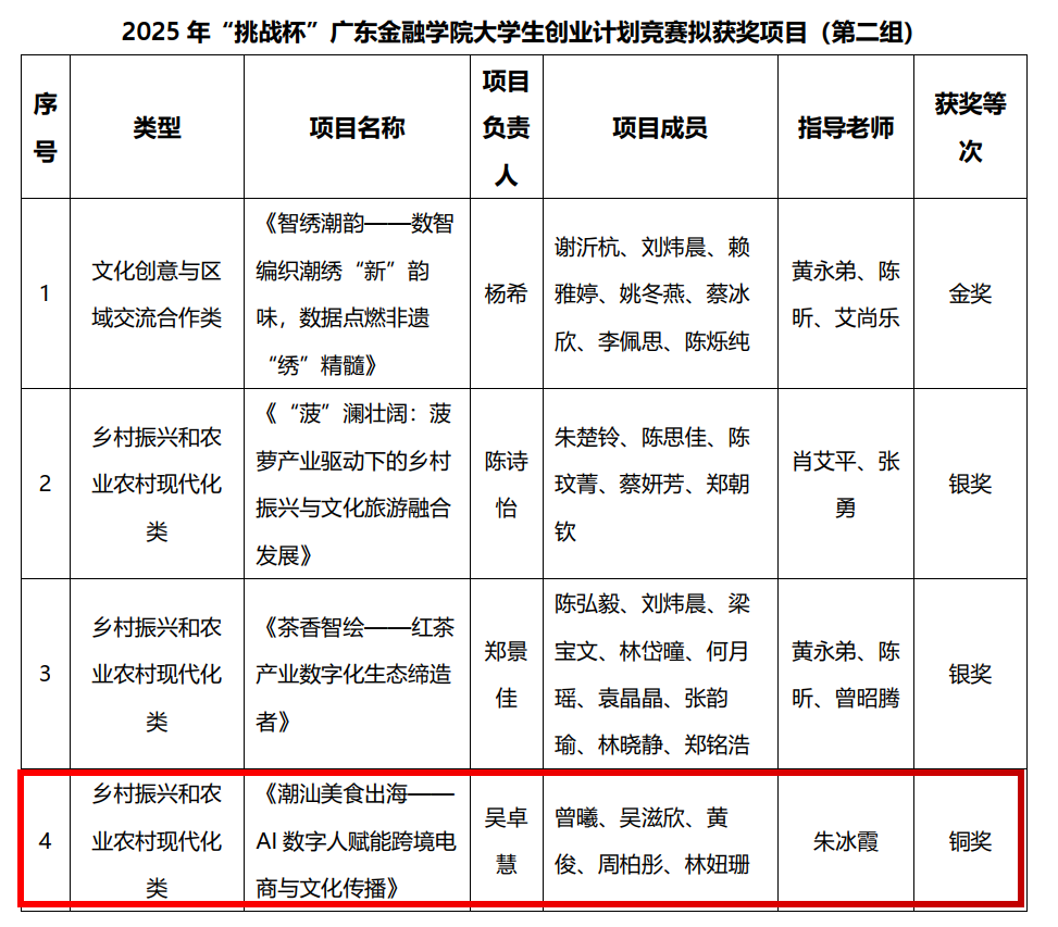该项目以潮汕特色美食为核心,创新引入AI 数字人技术,构建 “美食出海 +文化传播” 双驱动跨境电商模式。团队由吴卓慧担任负责人,曾曦、吴滋欣等成员组成。备赛期间,大家深入潮汕乡村调研产业痛点,分工优化方案、调试技术系统,反复打磨项目计划书;朱冰霞老师则从方向定位到商业逻辑梳理,全程提供专业指导,助力项目突围。