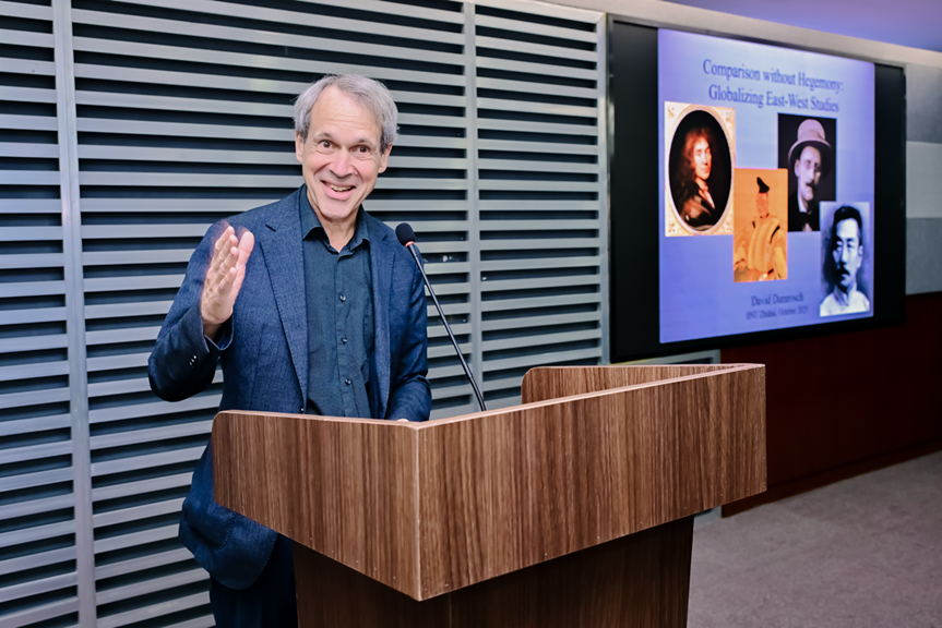 工作坊期间,哈佛大学原比较文学系系主任大卫·达姆罗什教授做了题为“胡适、林语堂与我:比较文学学者的跨文化路径”的专题讲座,并与清华大学陈永国教授等展开对谈。